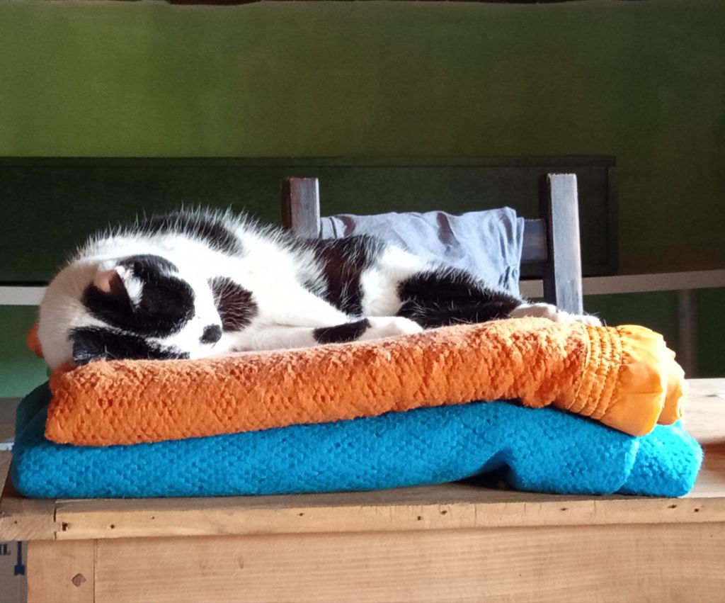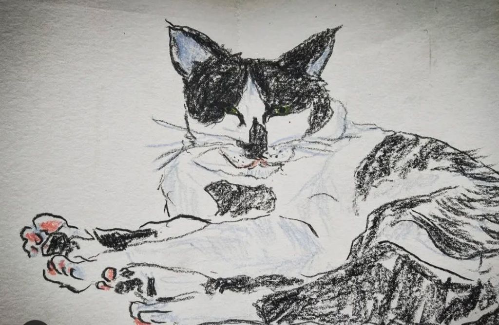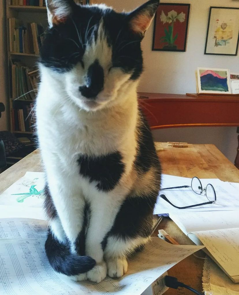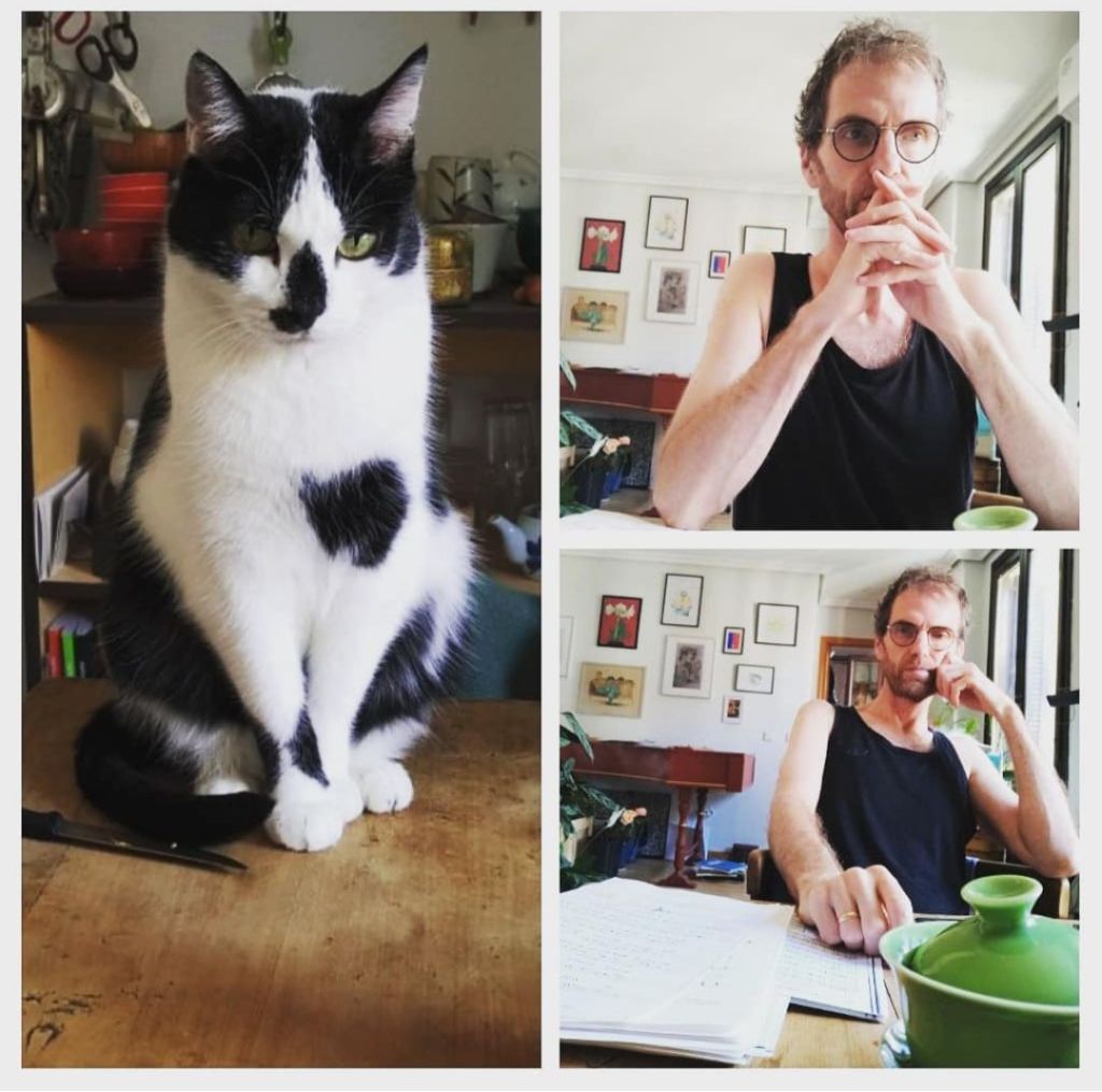 Our cat is called ‘Nariz’ (nose) and is a central Companion in our life. He was born in our garden in Alicante/Spain 18 years ago and moved with us to Switzerland, Paris and Madrid. He loves to put his paws with extra special weight onto my forearms when I am playing the harpsichord or piano and when I am drawing. When I am writing music he absolutely needs to sit on top of my music paper, it is always his! He is a master of manipulation and pure love.