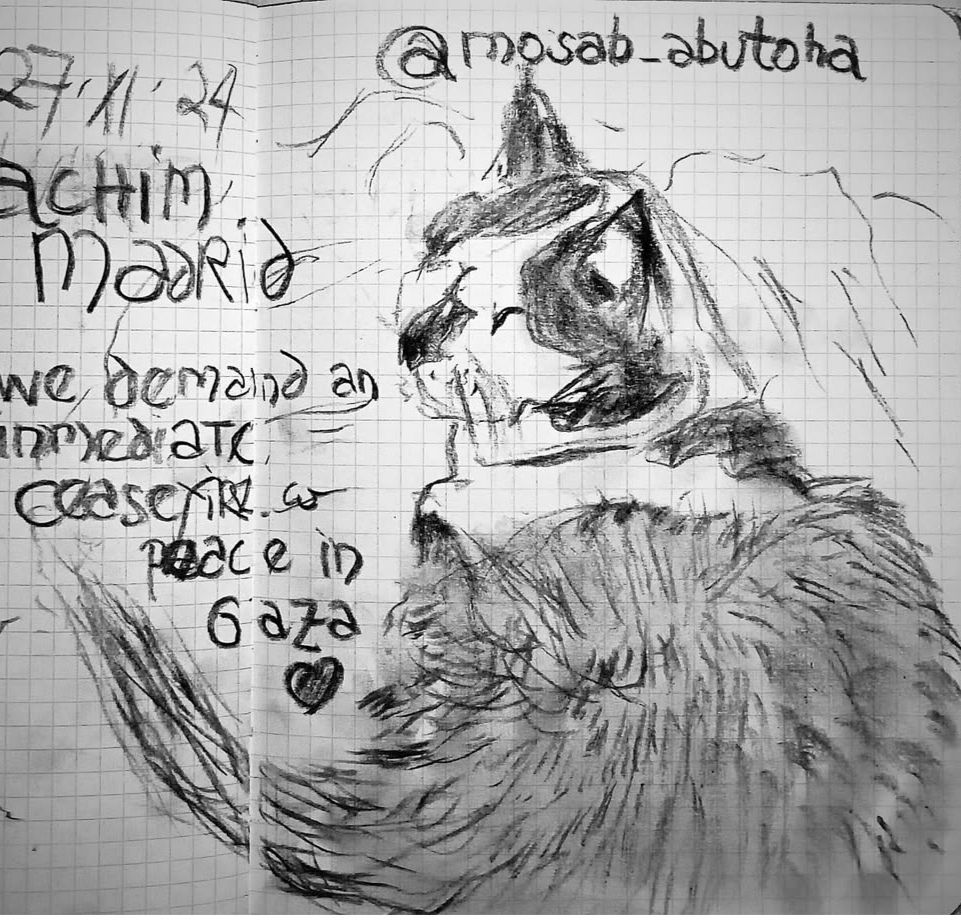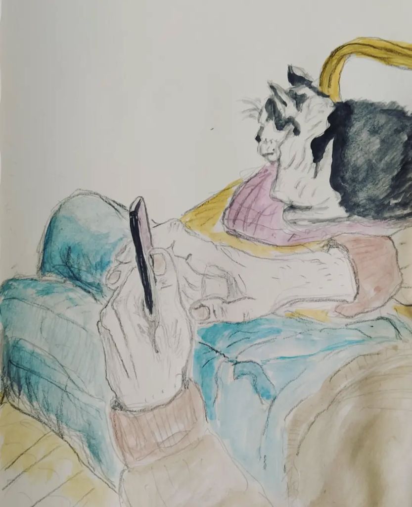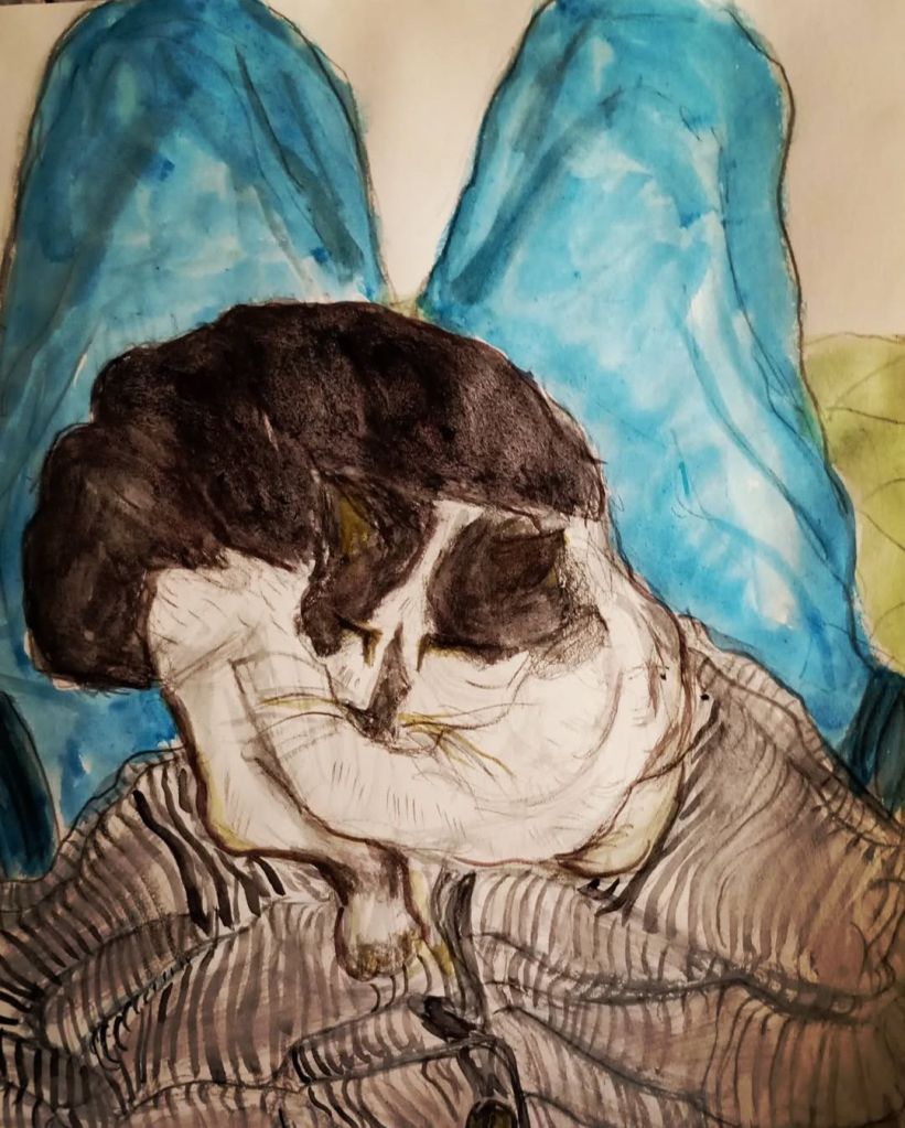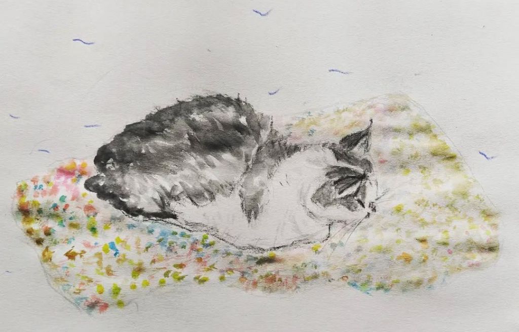 Our cat is called ‘Nariz’ (nose) and is a central Companion in our life. He was born in our garden in Alicante/Spain 18 years ago and moved with us to Switzerland, Paris and Madrid. He loves to put his paws with extra special weight onto my forearms when I am playing the harpsichord or piano and when I am drawing. When I am writing music he absolutely needs to sit on top of my music paper, it is always his! He is a master of manipulation and pure love.