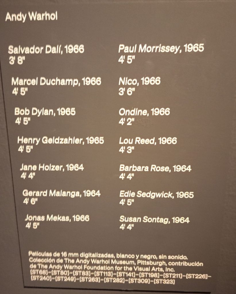Al final, cómo no, aguardaba la sala de vídeo. Confieso mi prevención: esas sombras proyectadas suelen cansarme. Pero esta vez, algo me detuvo. Era una película de Warhol, un desfile de almas: Bob Dylan, Dalí, Susan Sontag, Lou Reed… Todos callados, quietos, mirados. Cuatro minutos de eternidad cada uno.